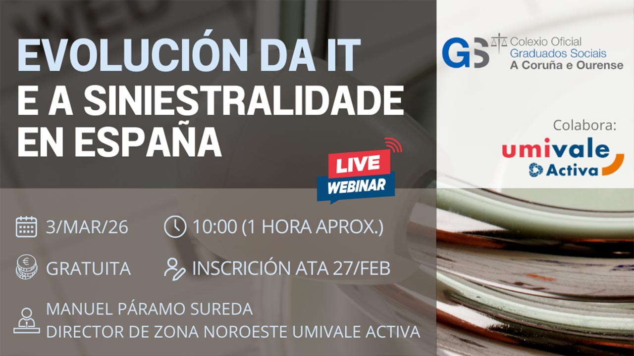 El Colegio de Graduados Sociales de A Coruña y Ourense organiza una jornada gratuita online el 3 de marzo de 2026 sobre la Evolución de la IT y la siniestralidad en España. En este encuentro formativo sobre el “Estudio socioeconómico de la evolución de la IT y la siniestralidad en España” se analizarán las tendencias, causas y factores del aumento de la incapacidad temporal y el absentismo laboral. Se abordará su impacto en empresas y sistema sanitario, sectores más afectados, comparación europea, evolución normativa y posibles medidas de actuación.