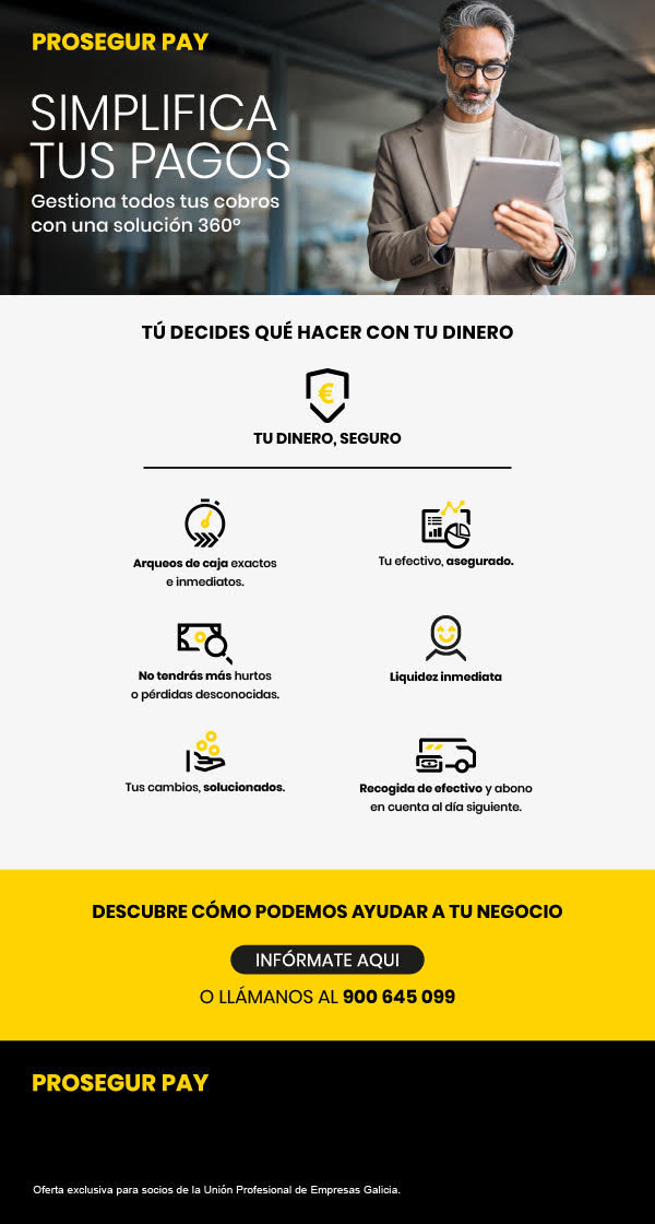 Unión Profesional de Galicia incorpora una nueva ventaja para sus entidades asociadas: la solución integral de gestión de cobros Prosegur Pay, un servicio pensado para ofrecer seguridad, eficiencia y control absoluto sobre los movimientos económicos diarios.